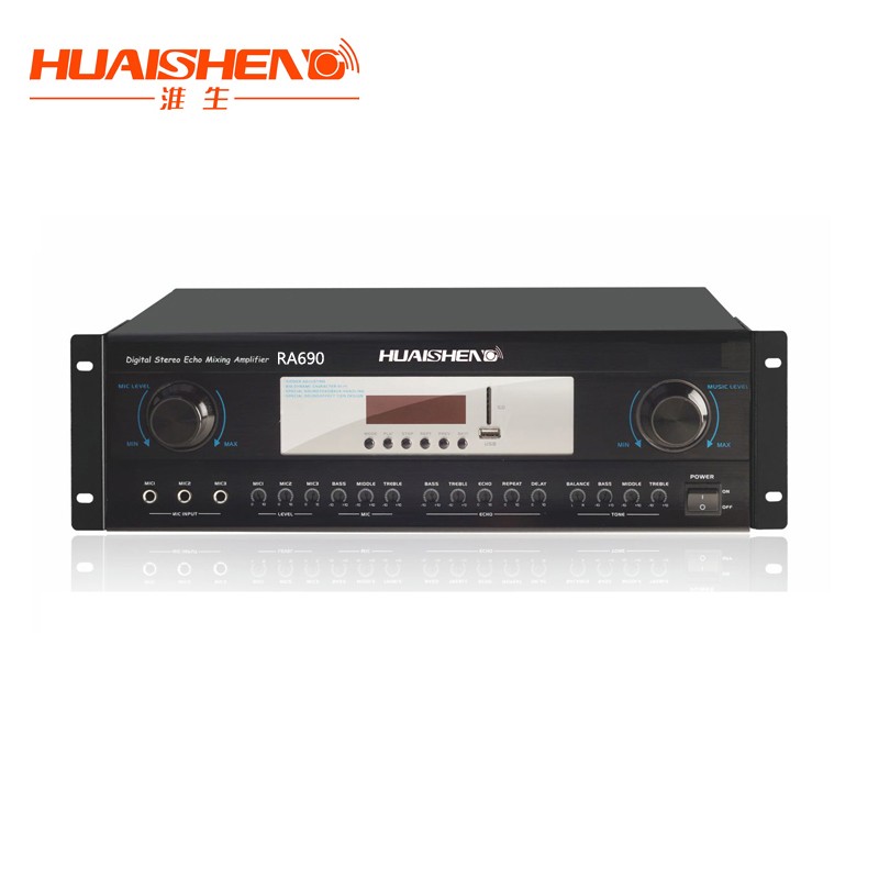 1.活筒回声、活筒直达声和音乐通道的音量単独控制。内置 活筒低音、高音音凋和3路独立活筒音量凋节内置活筒效果凋.双通道四段輸出电平指示。智能温控系統,散裁部件与温感系統连动。